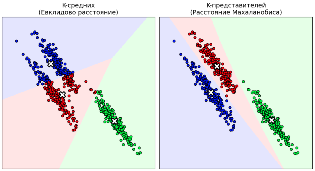 Сравнение разбиения кластеров эллипсоидальной формы с помощью K-средних и K-представителей с расстоянием Махаланобиса приведён ниже: