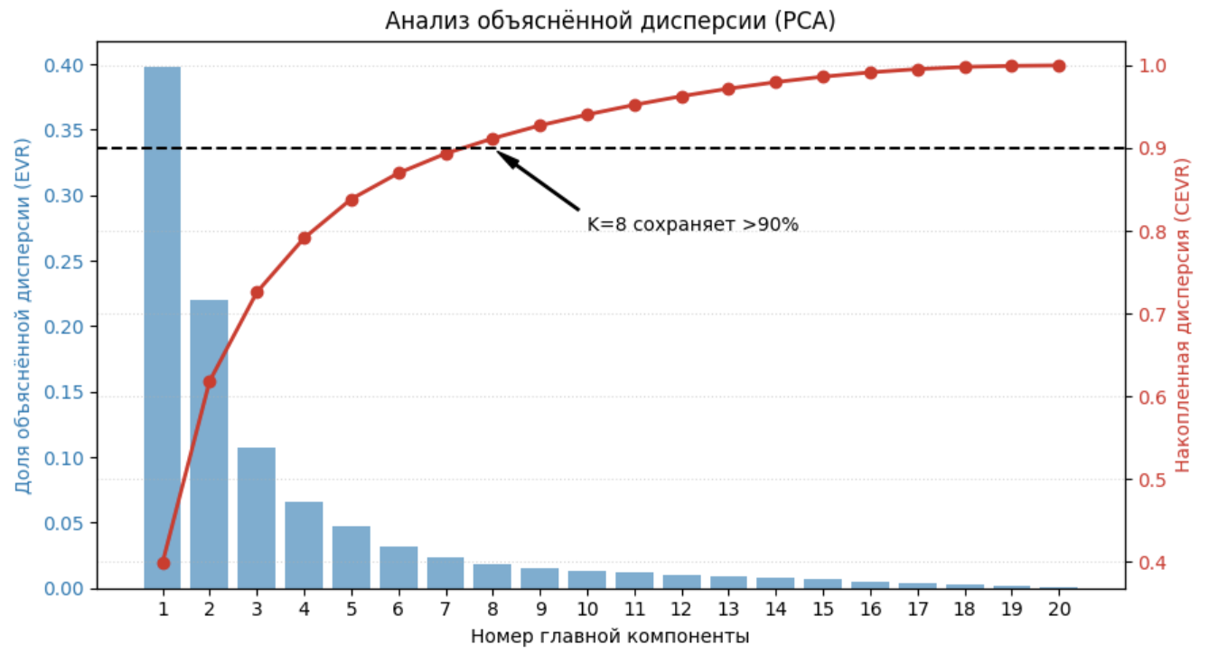 Накопленная доля объяснённой дисперсии (Cumulative Explained Variance Ratio, CEVR) характеризует суммарную информативность первых KK выбранных главных компонент: